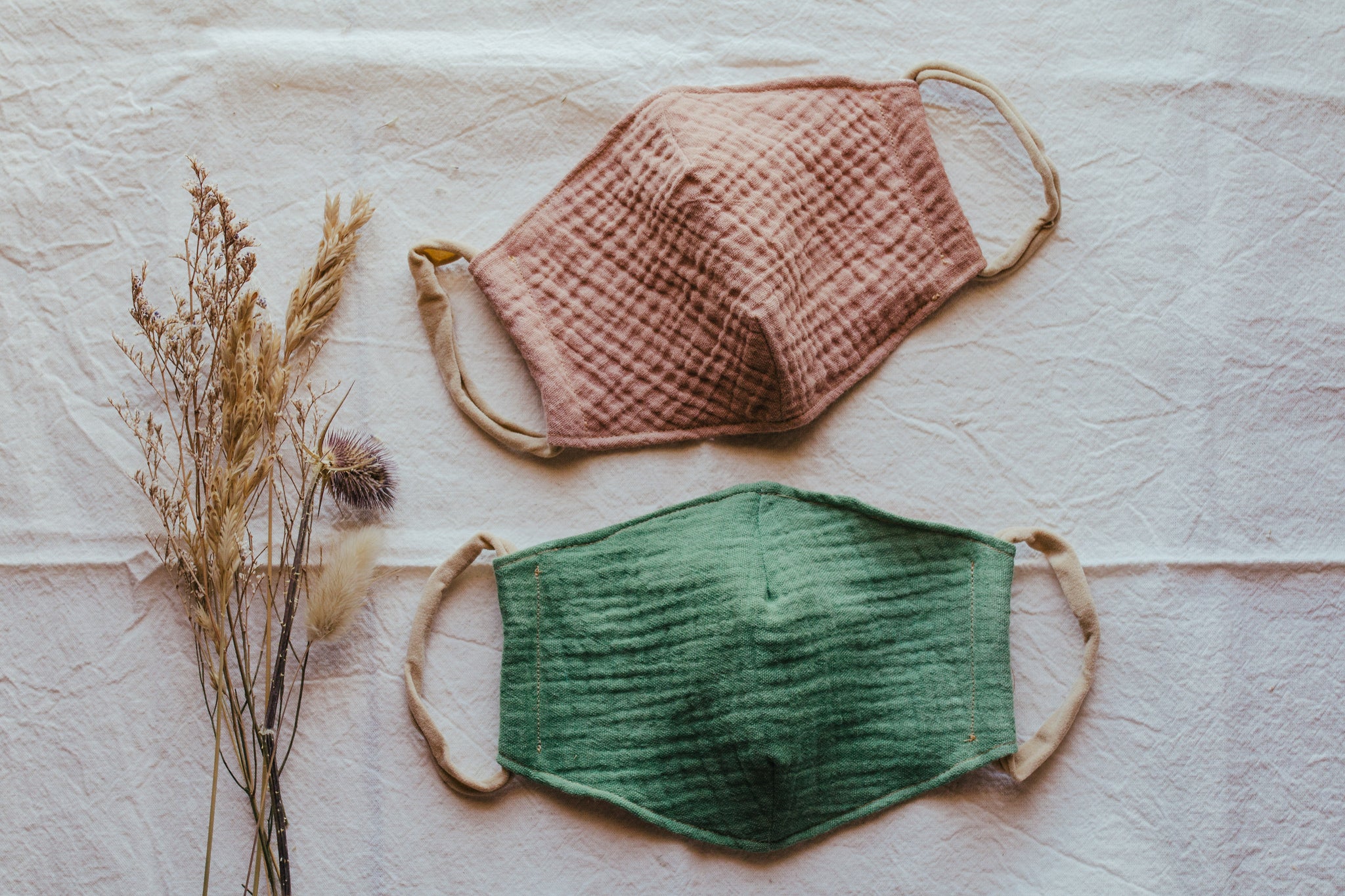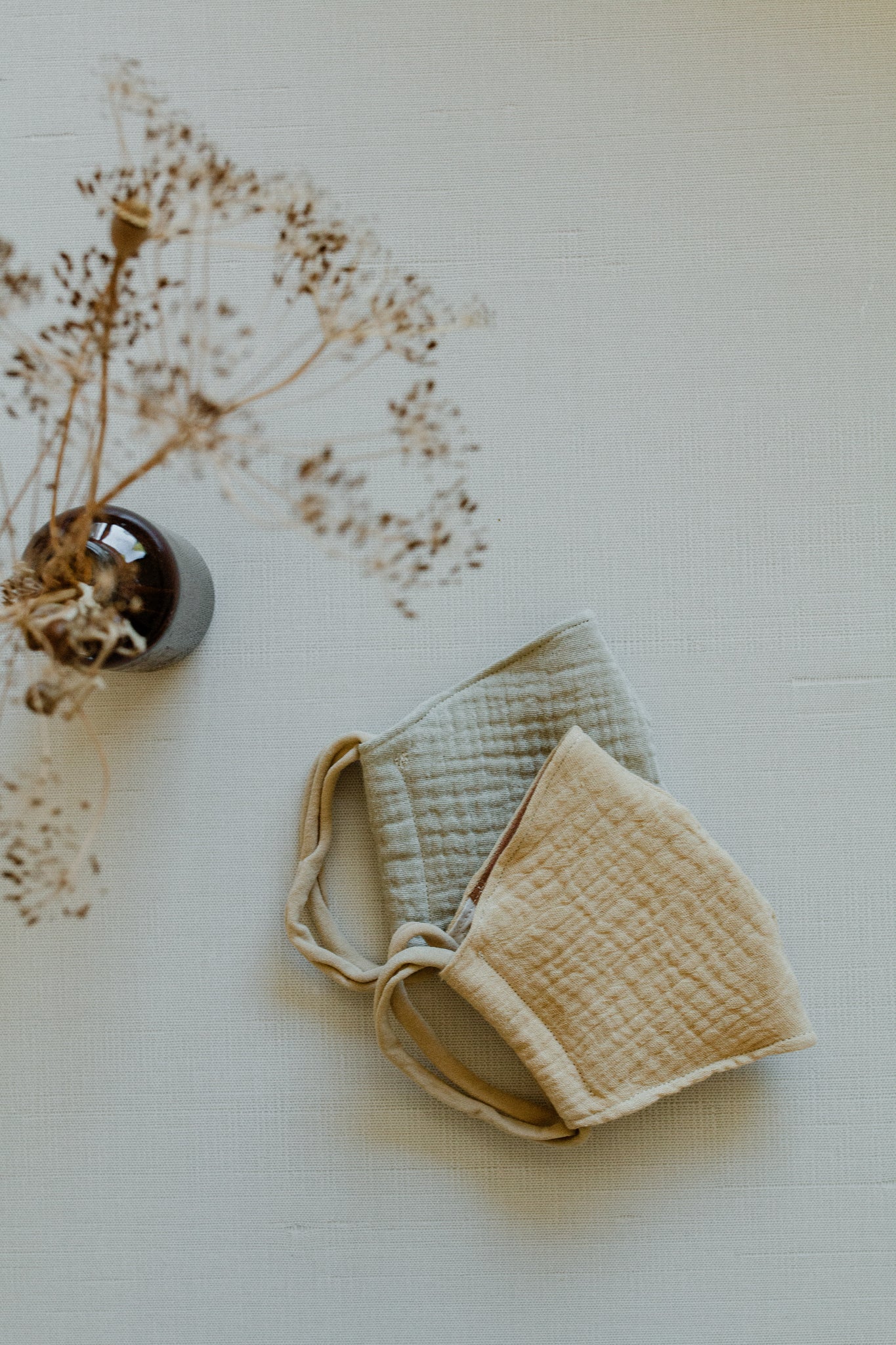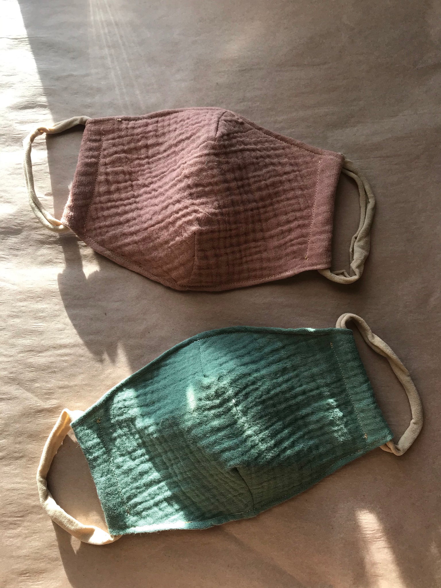 Sustainable organic cotton gauze face masks made in 3 layers of natural and soft 100% cotton, naturally dyed BY HAND in many earthy and neutral colors and with an inside pocket to put a filter (and change every time you want) and have a pair of nylon headbands on each side.