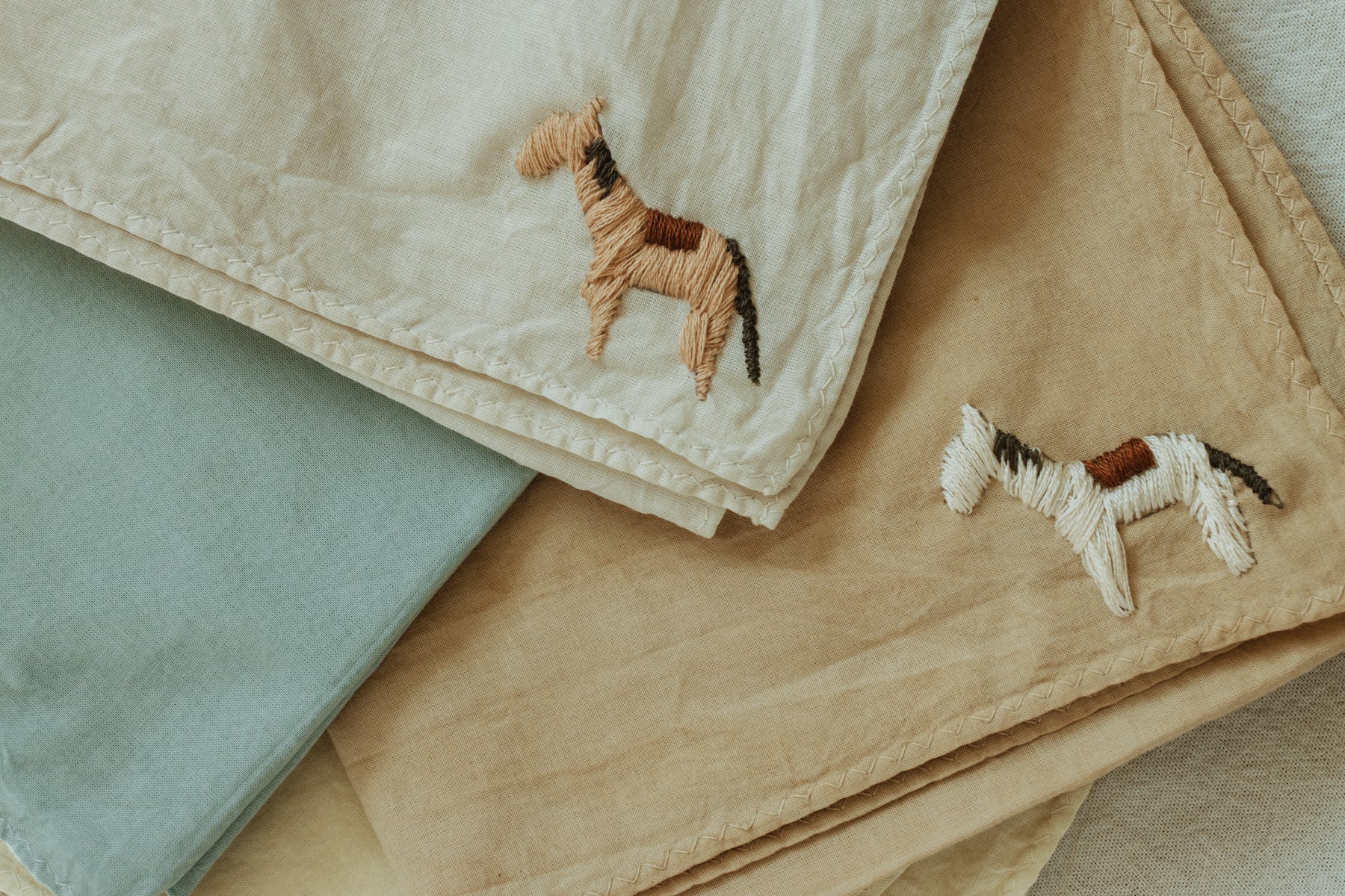 I must say this is probably my favorite bandana so far... made in a soft, cotton gauze bandana, hand embroidered as always and dyed in small batches : the story of a little tiny, horse ... Embroider by hand in neutral tones and in a minimal style, it would be THE perfect gift for the modern Cowboy or Cowgirl...