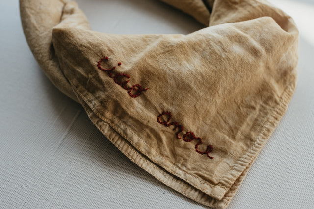 The simpler, the better... Add a minimal and natural detail to your wardrobe with this organic and 100% soft cotton naturally dyed bandana! I hand embroidered this bandanas to add some custom details with this love quotes.