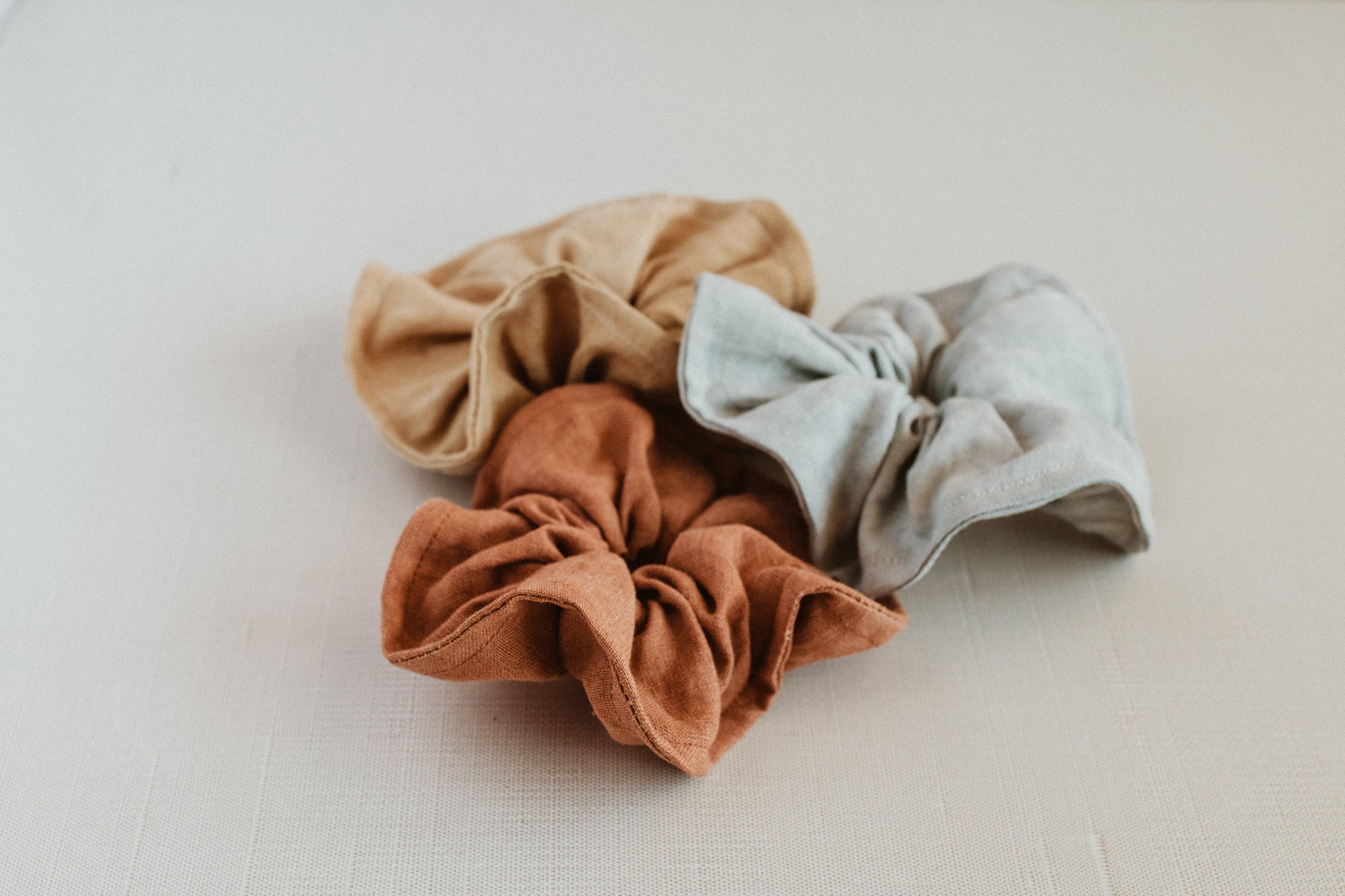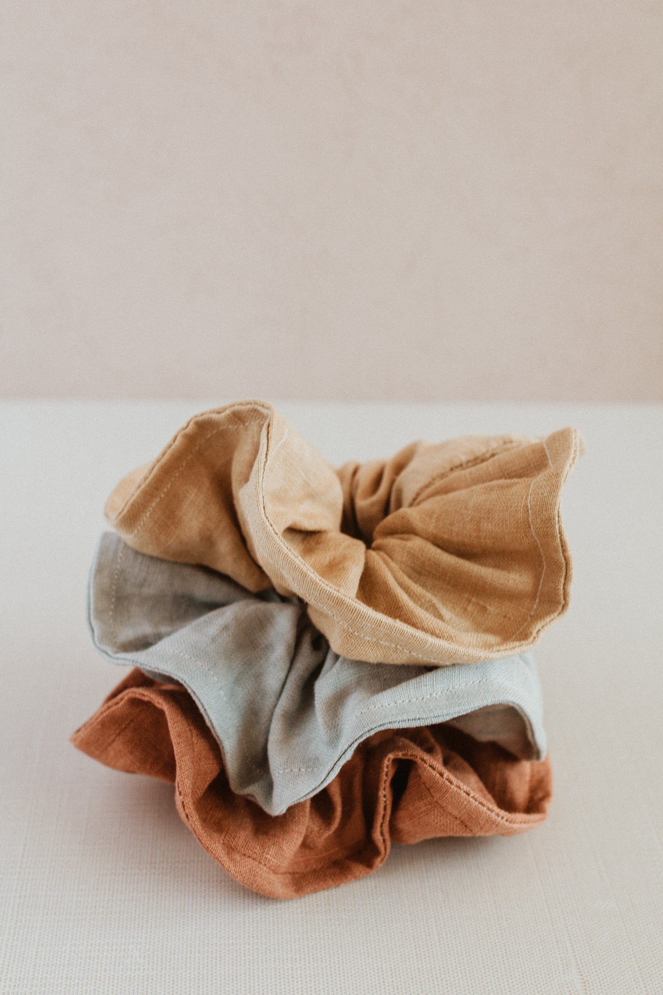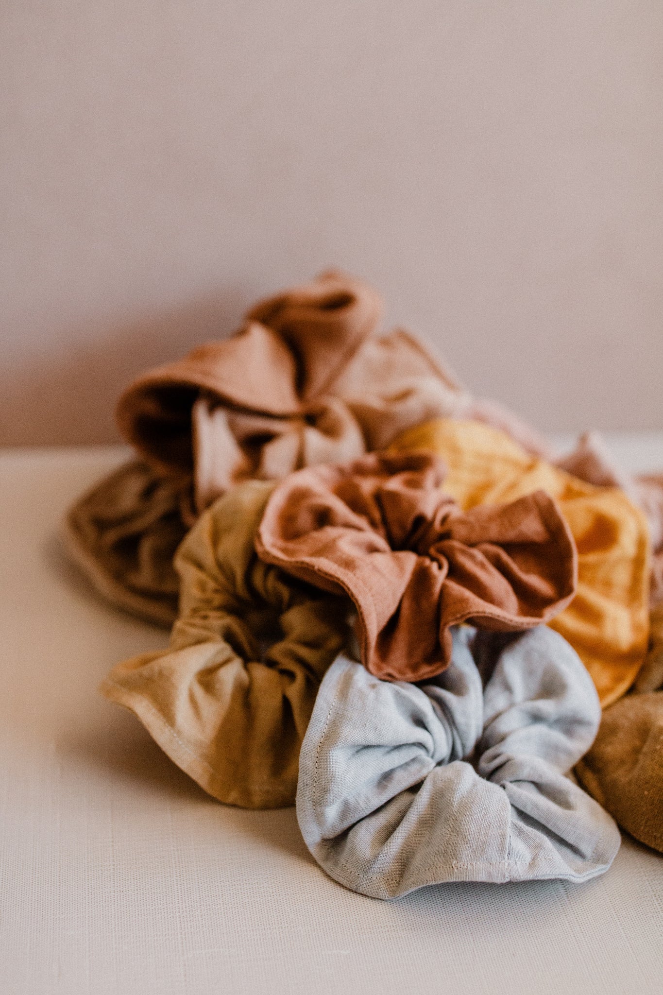 Scrunchies are the trendiest item right now and these XL size and plant dyed organic linen ones are gorgeous. Wear them in your hair or around your wrist!